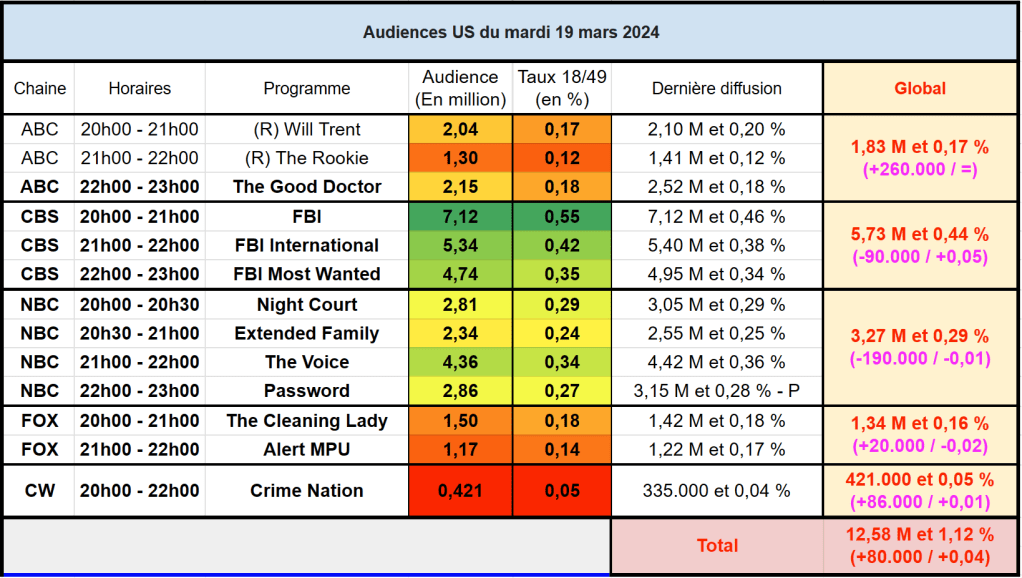 Audiences US du Mardi 19.03.24 : FBI toujours puissant leader. Night Court en baisse. The Good Doctor et les séries de FOX en grande difficulté. Thomas Fusil Communiqués Audiences US 23 mars 2024 1 Minute Voici les audiences de la soirée du 19 Mars Partager : Partager sur X(ouvre dans une nouvelle fenêtre) X Partager sur Facebook(ouvre dans une nouvelle fenêtre) Facebook J’aime chargement… Similaire Publié par Thomas Fusil Voir tous les articles par Thomas Fusil Publié 23 mars 2024