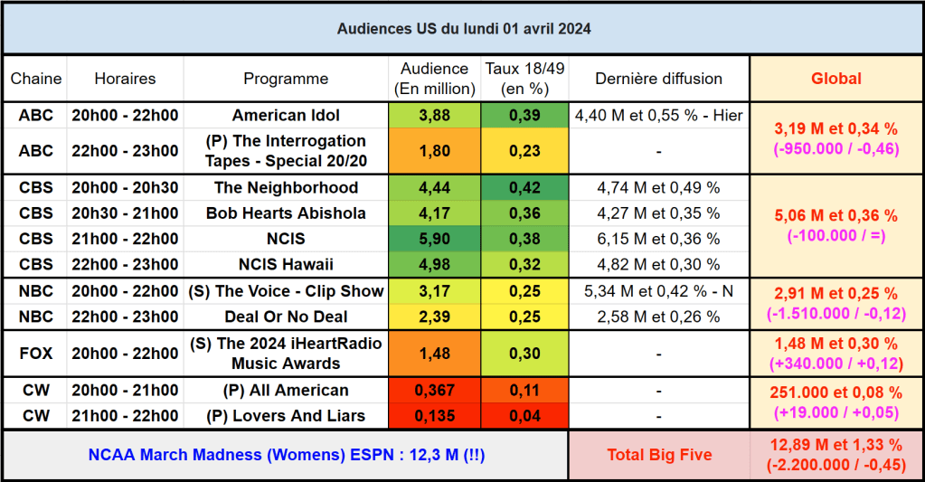 Audiences US du Lundi 01.04.24 : NCIS large leader en baisse. NCIS Hawaii progresse. American Idol timide sur ABC. Flop pour CW Thomas Fusil Communiqués Audiences US 7 avril 2024 1 Minute Voici les audiences de la soirée du 1er Avril Partager : Partager sur X(ouvre dans une nouvelle fenêtre) X Partager sur Facebook(ouvre dans une nouvelle fenêtre) Facebook J’aime chargement… Similaire Publié par Thomas Fusil Voir tous les articles par Thomas Fusil Publié 7 avril 2024