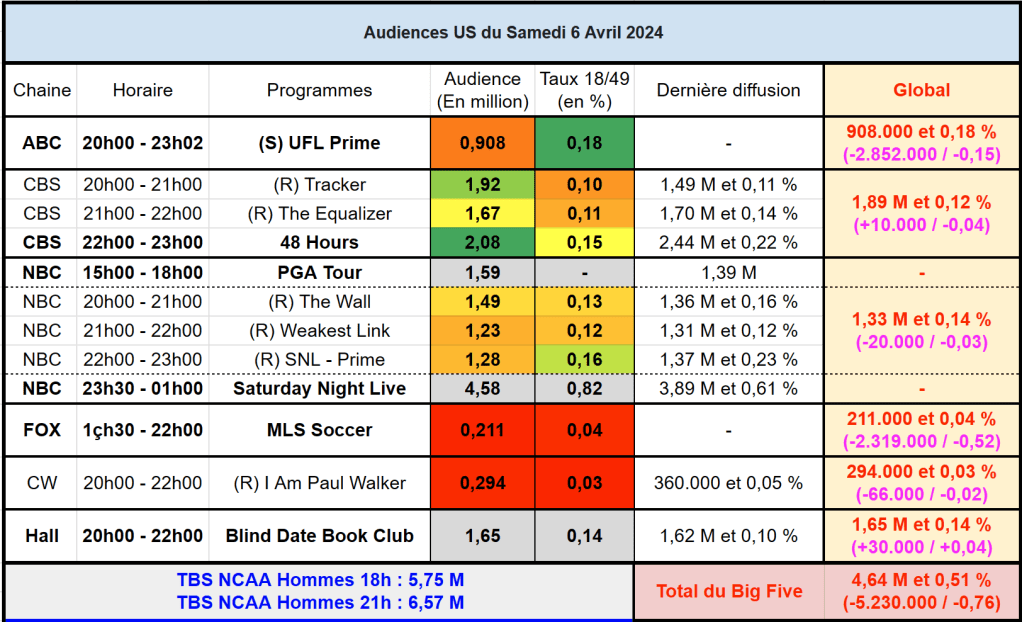 Audiences US du Samedi 06.04.24 : Toutes les chaines sont sous les 2M. 48 Hours petit leader. Hallmark devant ABC et NBC. CW double FOX qui est très faible. Thomas Fusil Communiqués Audiences US 10 avril 202413 avril 2024 1 Minute Voici les audiences de la soirée du 6 Avril Partager : Partager sur X(ouvre dans une nouvelle fenêtre) X Partager sur Facebook(ouvre dans une nouvelle fenêtre) Facebook J’aime chargement… Similaire Publié par Thomas Fusil Voir tous les articles par Thomas Fusil Publié 10 avril 202413 avril 2024