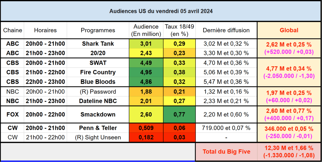 Audiences US du Vendredi 05.04.24 : Fire Country passe devant Blue Blood et domine la soirée. Dateline en petite forme. FOX au top sur cible. Thomas Fusil Communiqués Audiences US 10 avril 202413 avril 2024 1 Minute Voici les audiences de la soirée du 5 Avril Partager : Partager sur X(ouvre dans une nouvelle fenêtre) X Partager sur Facebook(ouvre dans une nouvelle fenêtre) Facebook J’aime chargement… Similaire Publié par Thomas Fusil Voir tous les articles par Thomas Fusil Publié 10 avril 202413 avril 2024