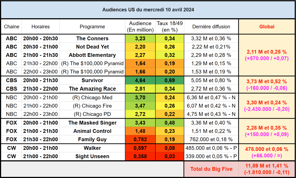 Audiences US du Mercredi 10.04.24 : Survivor large leader en baisse. Le One Chicago séduit même en rediff. Nette hausse pour Walker sur CW. Thomas Fusil Communiqués Audiences US 13 avril 2024 1 Minute Voici les audiences de la soirée du 10 Avril Partager : Partager sur X(ouvre dans une nouvelle fenêtre) X Partager sur Facebook(ouvre dans une nouvelle fenêtre) Facebook J’aime chargement… Similaire Publié par Thomas Fusil Voir tous les articles par Thomas Fusil Publié 13 avril 2024
