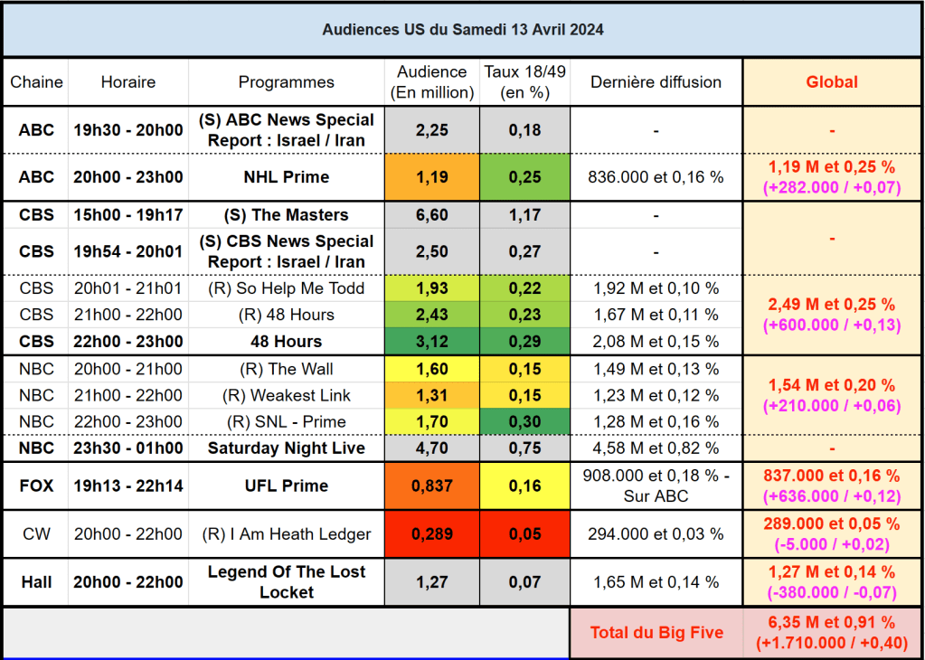 Audiences US du Samedi 13.04.24 : 48 Hours au plus haut depuis Mars 2022 sur CBS. SNL en hausse à 22h et à 23h30. Hallmark en forte baisse. Thomas Fusil Communiqués Audiences US 17 avril 2024 1 Minute Voici les audiences de la soirée du 13 Avril Partager : Partager sur X(ouvre dans une nouvelle fenêtre) X Partager sur Facebook(ouvre dans une nouvelle fenêtre) Facebook J’aime chargement… Similaire Publié par Thomas Fusil Voir tous les articles par Thomas Fusil Publié 17 avril 2024