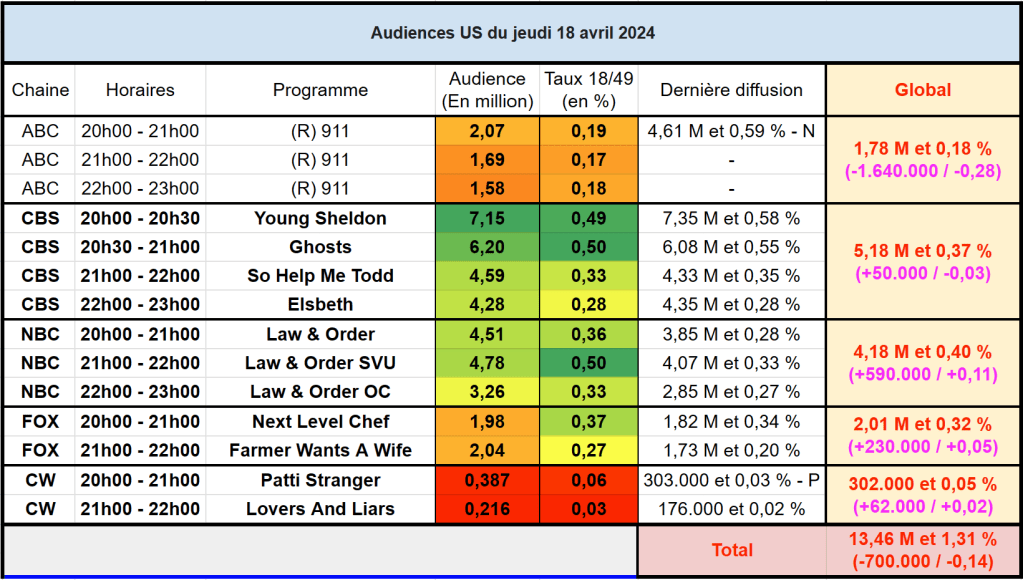 Audiences US du Jeudi 18.04.24 : Young Sheldon puissant leader. Ghosts au top sur CBS. Law & Order SVU en belle forme. Farmer Wants A Wife au plus haut sur FOX. Thomas Fusil Communiqués Audiences US 20 avril 2024 1 Minute Voici les audiences de la soirée du 18 Avril Partager : Partager sur X(ouvre dans une nouvelle fenêtre) X Partager sur Facebook(ouvre dans une nouvelle fenêtre) Facebook J’aime chargement… Similaire Publié par Thomas Fusil Voir tous les articles par Thomas Fusil Publié 20 avril 2024