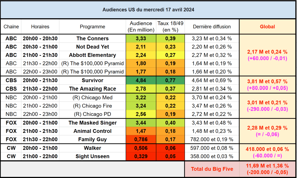 Audiences US du Mercredi 17.04.24 : Survivor net leader en hausse. NBC s’en sort bien en rediff. The Masked Singer stable. Thomas Fusil Communiqués Audiences US 20 avril 2024 1 Minute Voici les audiences de la soirée du 17 Avril Partager : Partager sur X(ouvre dans une nouvelle fenêtre) X Partager sur Facebook(ouvre dans une nouvelle fenêtre) Facebook J’aime chargement… Similaire Publié par Thomas Fusil Voir tous les articles par Thomas Fusil Publié 20 avril 2024