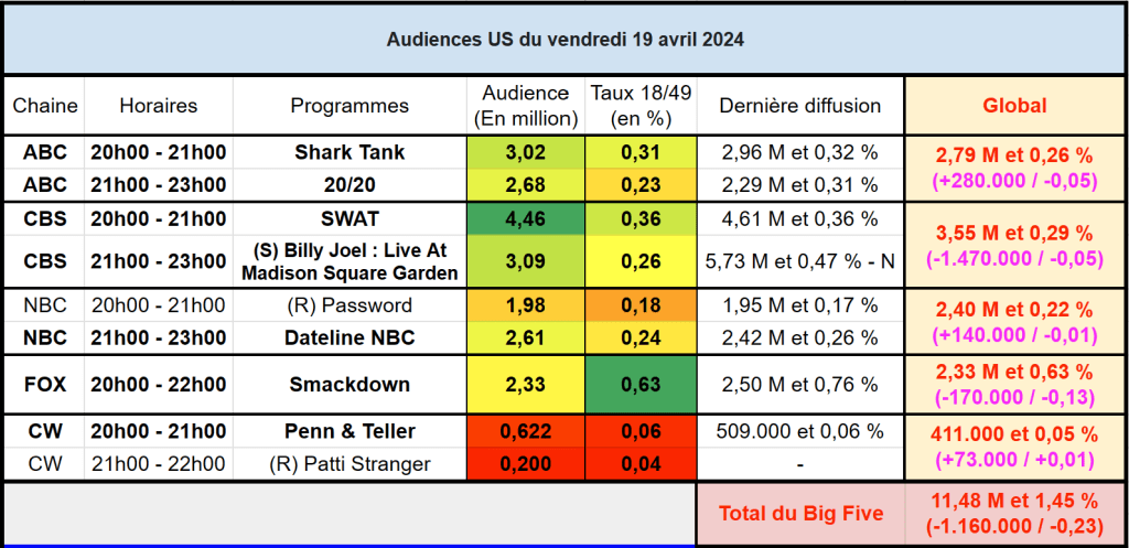 Audiences US du Vendredi 19.04.24 : SWAT leader en baisse sur CBS. Bon score pour la rediff du concert de Billy Joel. Smackdown recule. Thomas Fusil Communiqués Audiences US 23 avril 2024 1 Minute Voici les audiences de la soirée du 19 Avril Partager : Partager sur X(ouvre dans une nouvelle fenêtre) X Partager sur Facebook(ouvre dans une nouvelle fenêtre) Facebook J’aime chargement… Similaire Publié par Thomas Fusil Voir tous les articles par Thomas Fusil Publié 23 avril 2024