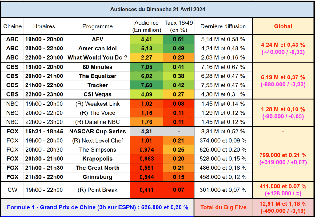 Audiences US du Dimanche 21.04.24 : Tracker puissant leader sur CBS. The Equalizer en baisse. American Idol en forte hausse. NBC très faible. Thomas Fusil Communiqués Audiences US 24 avril 2024 1 Minute Voici les audiences de la soirée du 21 Avril Partager : Partager sur X(ouvre dans une nouvelle fenêtre) X Partager sur Facebook(ouvre dans une nouvelle fenêtre) Facebook J’aime chargement… Similaire Publié par Thomas Fusil Voir tous les articles par Thomas Fusil Publié 24 avril 2024