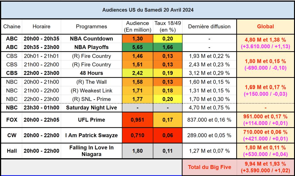 Audiences US du Samedi 20.04.24 : ABC puissant leader avec la NBA. 48 Hours chute. Record pour le film de CW. Hallmark au top. Thomas Fusil Communiqués Audiences US 24 avril 2024 1 Minute Voici les audiences de la soirée du 20 Avril Partager : Partager sur X(ouvre dans une nouvelle fenêtre) X Partager sur Facebook(ouvre dans une nouvelle fenêtre) Facebook J’aime chargement… Similaire Publié par Thomas Fusil Voir tous les articles par Thomas Fusil Publié 24 avril 2024