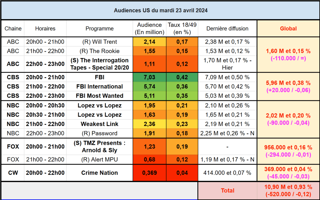 Audiences US du Mardi 23.04.24 : CBS puissant leader avec la franchise FBI. ABC très faible à 22h. Catastrophe pour Alert MPU en rediff. Thomas Fusil Communiqués Audiences US 25 avril 2024 1 Minute Voici les audiences de la soirée du 23 Avril Partager : Partager sur X(ouvre dans une nouvelle fenêtre) X Partager sur Facebook(ouvre dans une nouvelle fenêtre) Facebook J’aime chargement… Similaire Publié par Thomas Fusil Voir tous les articles par Thomas Fusil Publié 25 avril 2024