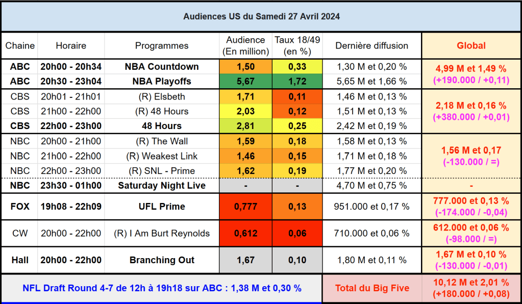 Audiences US du Samedi 27.04.24 : ABC puissant leader avec la NBA. 48 Hours en hausse. Hallmark devant NBC. Thomas Fusil Communiqués Audiences US 1 Mai 2024 1 Minute Voici les audiences de la soirée du 27 Avril Partager : Partager sur X(ouvre dans une nouvelle fenêtre) X Partager sur Facebook(ouvre dans une nouvelle fenêtre) Facebook J’aime chargement… Similaire Publié par Thomas Fusil Voir tous les articles par Thomas Fusil Publié 1 Mai 2024