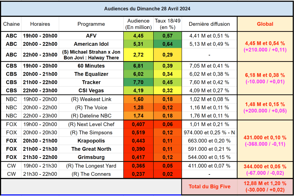 Audiences US du Dimanche 28.04.24 : Tracker leader au top sur CBS. American Idol au plus haut de la saison. FOX très faible. Thomas Fusil Communiqués Audiences US 2 Mai 2024 1 Minute Voici les audiences de la soirée du 28 Avril Partager : Partager sur X(ouvre dans une nouvelle fenêtre) X Partager sur Facebook(ouvre dans une nouvelle fenêtre) Facebook J’aime chargement… Similaire Publié par Thomas Fusil Voir tous les articles par Thomas Fusil Publié 2 Mai 2024