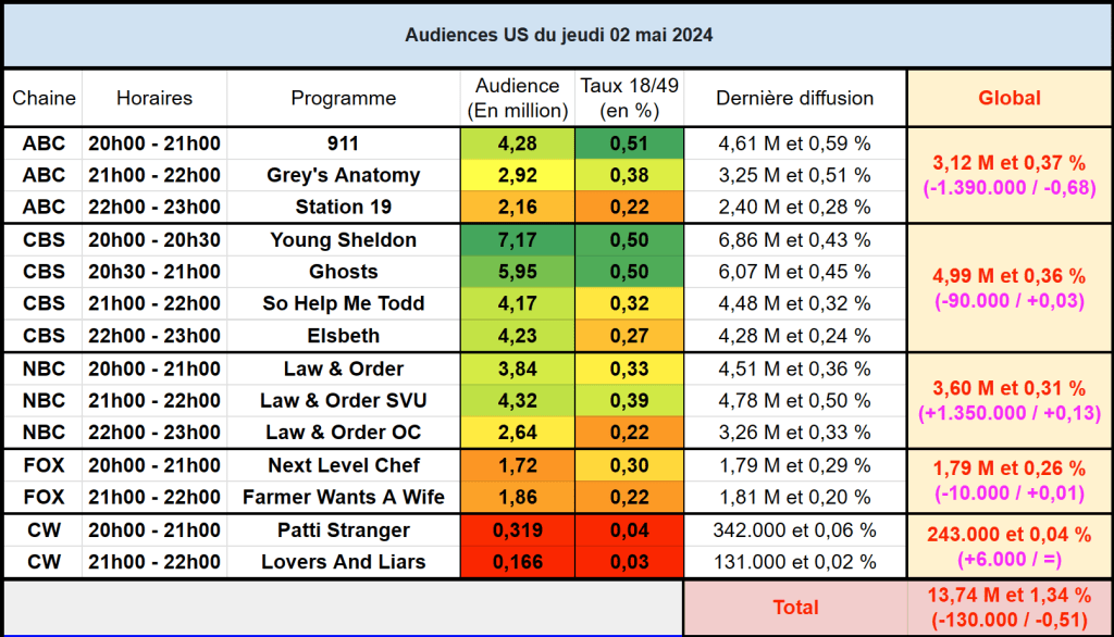 Audiences US du Jeudi 02.05.24 : Young Sheldon net leader. 911, Grey’s Anatomy, Station, So Help Me Todd, Elsbeth, Law & Order et Law & Order OC au plus bas. Thomas Fusil Communiqués Audiences US 8 Mai 2024 1 Minute Voici les audiences de la soirée du 2 Mai Partager : Partager sur X(ouvre dans une nouvelle fenêtre) X Partager sur Facebook(ouvre dans une nouvelle fenêtre) Facebook J’aime chargement… Similaire Publié par Thomas Fusil Voir tous les articles par Thomas Fusil Publié 8 Mai 2024