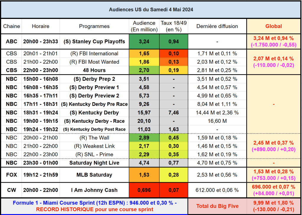 Audiences US du Samedi 04.05.24 : Record historique pour le Kentucky Derby et la course Sprint en Formule 1. Le Hockey au top en prime. NBC en belle forme. Thomas Fusil Communiqués Audiences US 8 Mai 2024 1 Minute Voici les audiences de la soirée du 4 Mai Partager : Partager sur X(ouvre dans une nouvelle fenêtre) X Partager sur Facebook(ouvre dans une nouvelle fenêtre) Facebook J’aime chargement… Similaire Publié par Thomas Fusil Voir tous les articles par Thomas Fusil Publié 8 Mai 2024