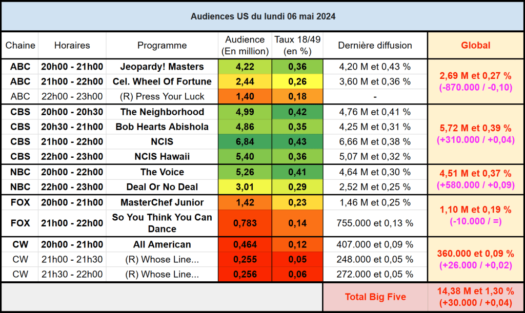 Audiences US du Lundi 06.05.24 : NCIS termine en belle forme sur CBS. The Voice et Deal Or No Deal en forte hausse. All American performe sur cible pour CW. Thomas Fusil Communiqués Audiences US 10 Mai 202410 Mai 2024 1 Minute Voici les audiences de la soirée du 6 Mai Partager : Partager sur X(ouvre dans une nouvelle fenêtre) X Partager sur Facebook(ouvre dans une nouvelle fenêtre) Facebook J’aime chargement… Similaire Publié par Thomas Fusil Voir tous les articles par Thomas Fusil Publié 10 Mai 202410 Mai 2024