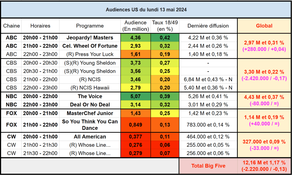 Audiences US du Lundi 13.05.24 : The Voice leader en baisse. Deal Or No Deal Island termine au plus haut sur NBC. CBS solide en rediffusion. Thomas Fusil Communiqués Audiences US 15 Mai 2024 1 Minute Voici les audiences de la soirée du 13 Mai Partager : Partager sur X(ouvre dans une nouvelle fenêtre) X Partager sur Facebook(ouvre dans une nouvelle fenêtre) Facebook J’aime chargement… Similaire Publié par Thomas Fusil Voir tous les articles par Thomas Fusil Publié 15 Mai 2024