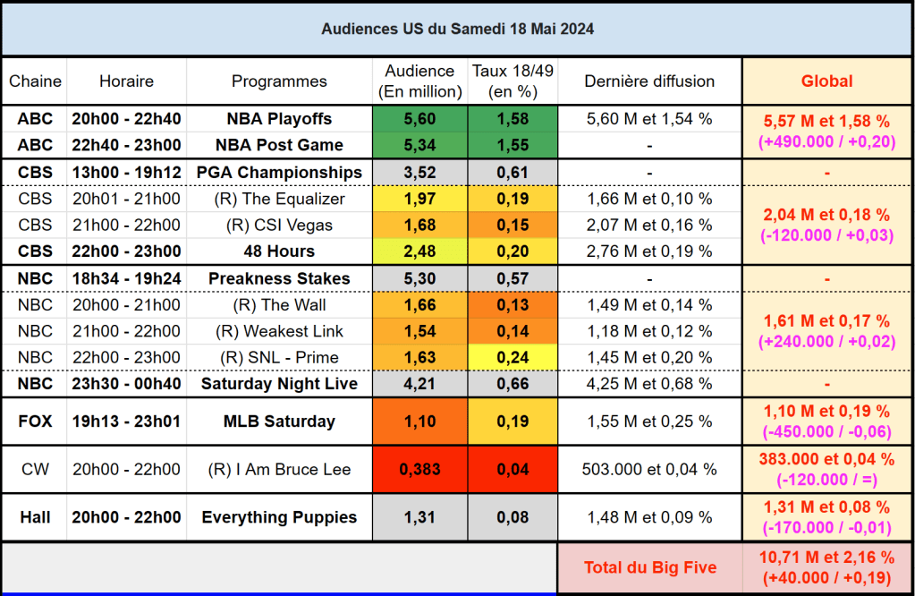 Audiences US du Samedi 18.05.24 : La NBA une nouvelle fois très large leader sur ABC. 48 Hours et la MLB perdent des téléspectateurs. Thomas Fusil Communiqués Audiences US 22 Mai 2024 1 Minute Voici les audiences de la soirée du 18 Mai Partager : Partager sur X(ouvre dans une nouvelle fenêtre) X Partager sur Facebook(ouvre dans une nouvelle fenêtre) Facebook J’aime chargement… Similaire Publié par Thomas Fusil Voir tous les articles par Thomas Fusil Publié 22 Mai 2024