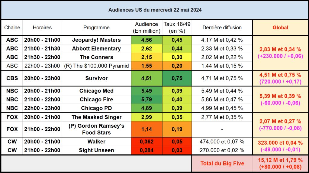 Audiences US du Mercredi 22.05.24 : Chicago Fire leader en baisse. Abbott Elementary en belle hausse. Survivor net leader cible. Thomas Fusil Communiqués Audiences US 27 Mai 2024 1 Minute Voici les audiences de la soirée du 22 Mai Partager : Partager sur X(ouvre dans une nouvelle fenêtre) X Partager sur Facebook(ouvre dans une nouvelle fenêtre) Facebook J’aime chargement… Similaire Publié par Thomas Fusil Voir tous les articles par Thomas Fusil Publié 27 Mai 2024