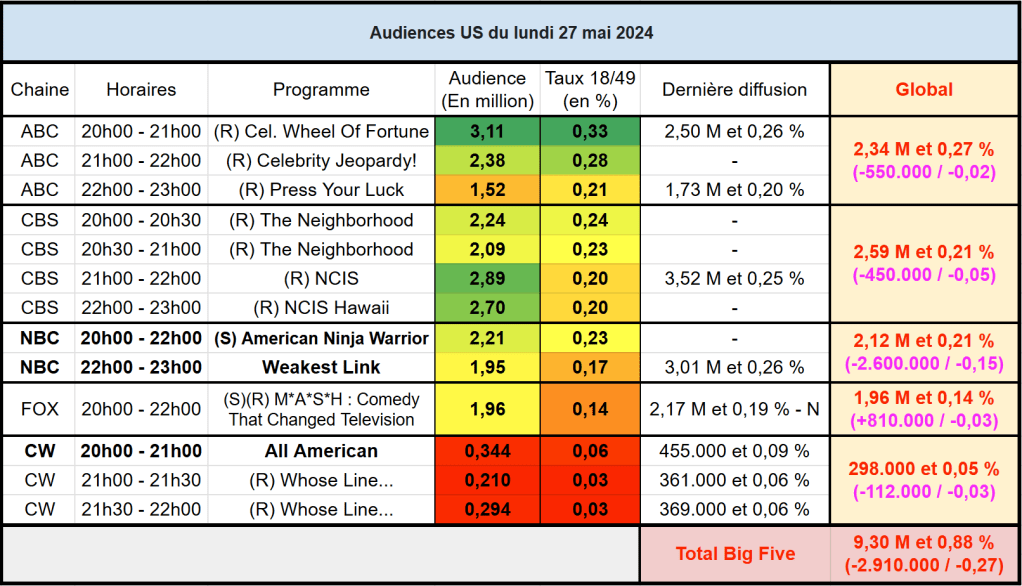 Audiences US du Lundi 27.05.24 : La rediff de Celebrity Wheel Of Fortune domine sur ABC. FOX s’en sort bien avec M*A*S*H. Weakest Link plonge. Thomas Fusil Communiqués Audiences US 1 juin 2024 1 Minute Voici les audiences de la soirée du 27 Mai Partager : Partager sur X(ouvre dans une nouvelle fenêtre) X Partager sur Facebook(ouvre dans une nouvelle fenêtre) Facebook J’aime chargement… Similaire Publié par Thomas Fusil Voir tous les articles par Thomas Fusil Publié 1 juin 2024