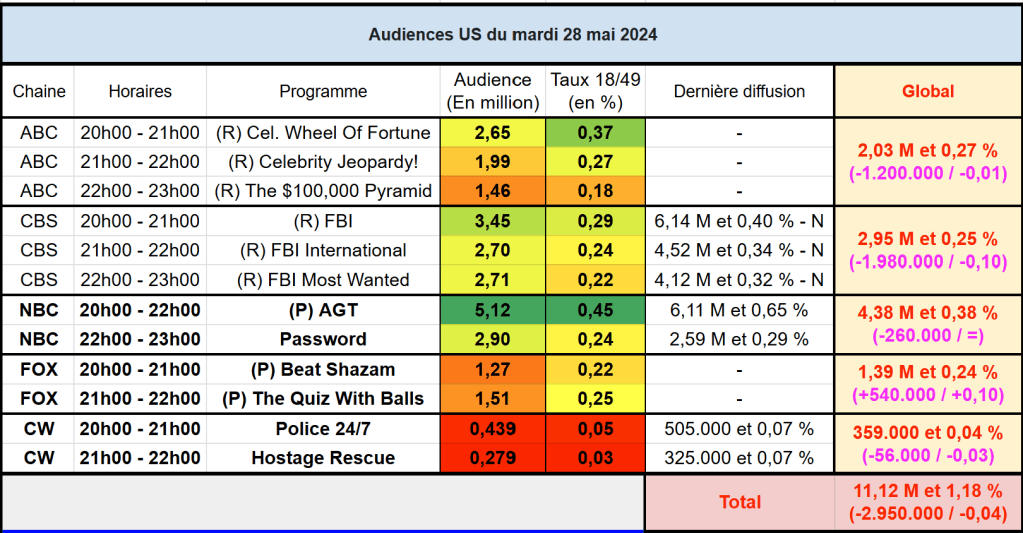 Audiences US du Mardi 28.05.24 : AGT de retour largement en tête mais en très forte baisse. CBS s’en sort bien en rediffusion. FOX faible. Thomas Fusil Communiqués Audiences US 1 juin 20241 juin 2024 1 Minute Voici les audiences de la soirée du 28 Mai Partager : Partager sur X(ouvre dans une nouvelle fenêtre) X Partager sur Facebook(ouvre dans une nouvelle fenêtre) Facebook J’aime chargement… Similaire Publié par Thomas Fusil Voir tous les articles par Thomas Fusil Publié 1 juin 20241 juin 2024