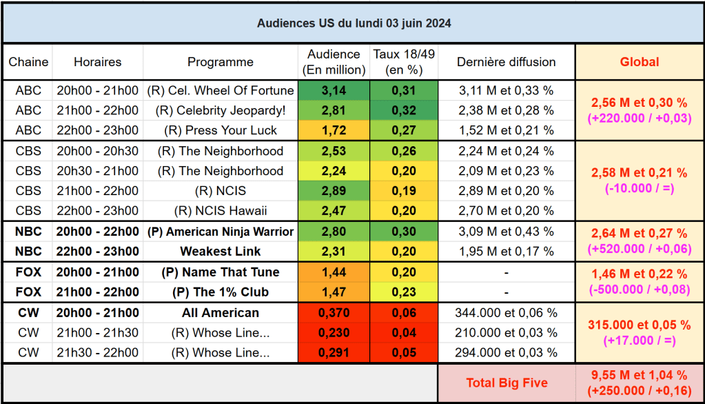 Audiences US du Lundi 03.06.24 : Celebrity Wheel Of Fortune leader en rediffusion. American Ninja Warrior de retour en baisse sur NBC. Thomas Fusil Communiqués Audiences US 7 juin 2024 1 Minute Voici les audiences US de la soirée du 3 Juin Audiences triées (téléspectateurs) Partager : Partager sur X(ouvre dans une nouvelle fenêtre) X Partager sur Facebook(ouvre dans une nouvelle fenêtre) Facebook J’aime chargement… Similaire Publié par Thomas Fusil Voir tous les articles par Thomas Fusil Publié 7 juin 2024