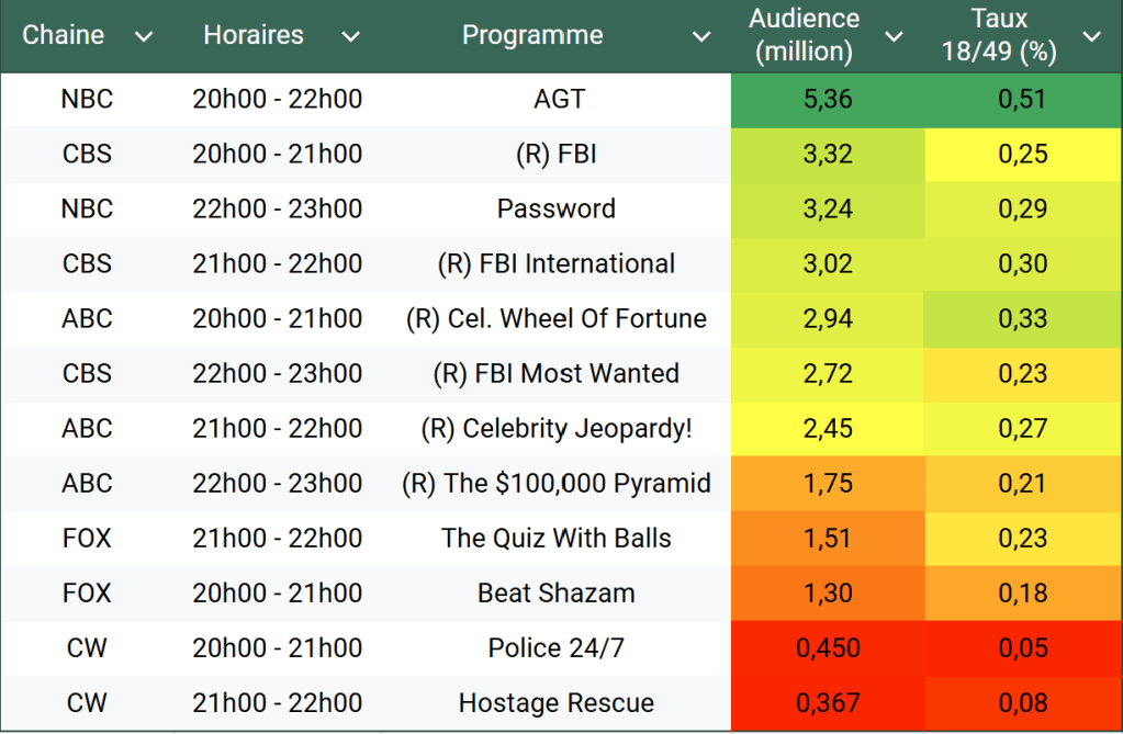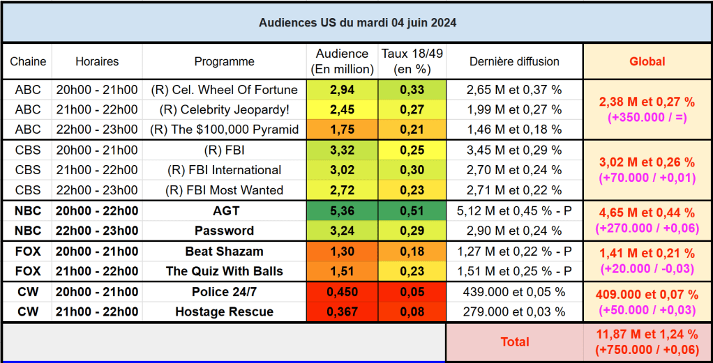 Audiences US du Mardi 04.06.24 : AGT progresse et s’impose largement sur NBC. The Quiz With Balls stable en deuxième semaine. Thomas Fusil Communiqués Audiences US 7 juin 2024 1 Minute Voici les audiences de la soirée du 4 Juin Les audiences triées (téléspectateurs) Partager : Partager sur X(ouvre dans une nouvelle fenêtre) X Partager sur Facebook(ouvre dans une nouvelle fenêtre) Facebook J’aime chargement… Similaire Publié par Thomas Fusil Voir tous les articles par Thomas Fusil Publié 7 juin 2024
