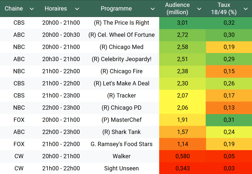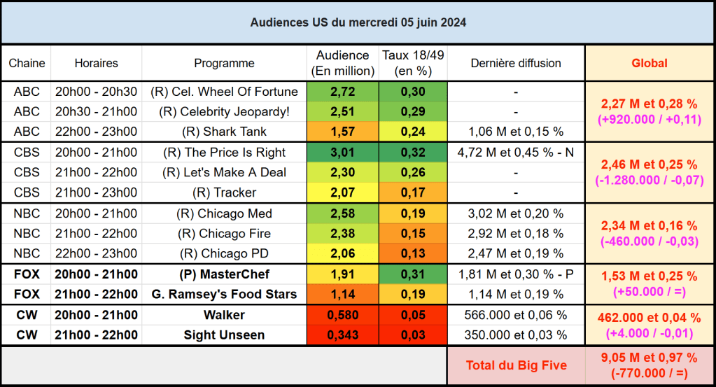 Audiences US du Mercredi 05.06.24 : The Price Is Right, seul programme au dessus des 3M, domine la soirée. MasterChef en hausse. ABC solide. Thomas Fusil Communiqués Audiences US 7 juin 2024 1 Minute Voici les audiences de la soirée du 5 Juin Audiences triées (téléspectateurs) Partager : Partager sur X(ouvre dans une nouvelle fenêtre) X Partager sur Facebook(ouvre dans une nouvelle fenêtre) Facebook J’aime chargement… Similaire Publié par Thomas Fusil Voir tous les articles par Thomas Fusil Publié 7 juin 2024
