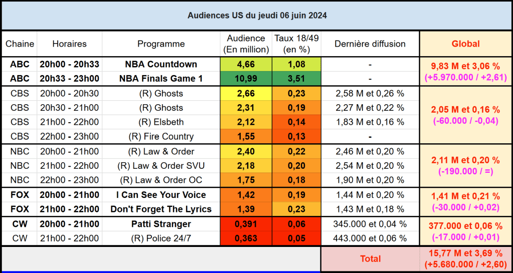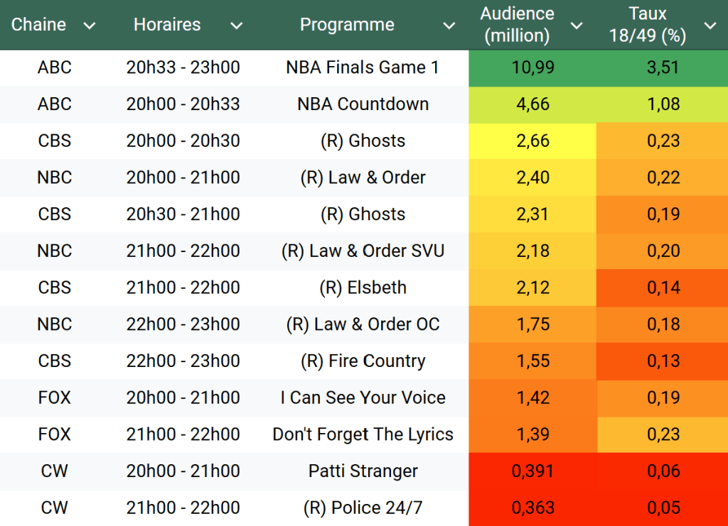 Audiences US du Jeudi 06.06.24 : ABC écrase la concurrence avec la NBA. Toutes les autres chaines sont en baisse en rediffusion. Thomas Fusil Communiqués Audiences US 9 juin 2024 1 Minute Voici les audiences de la soirée du 6 Juin Les audiences triées (téléspectateurs) Partager : Partager sur X(ouvre dans une nouvelle fenêtre) X Partager sur Facebook(ouvre dans une nouvelle fenêtre) Facebook J’aime chargement… Similaire Publié par Thomas Fusil Voir tous les articles par Thomas Fusil Publié 9 juin 2024