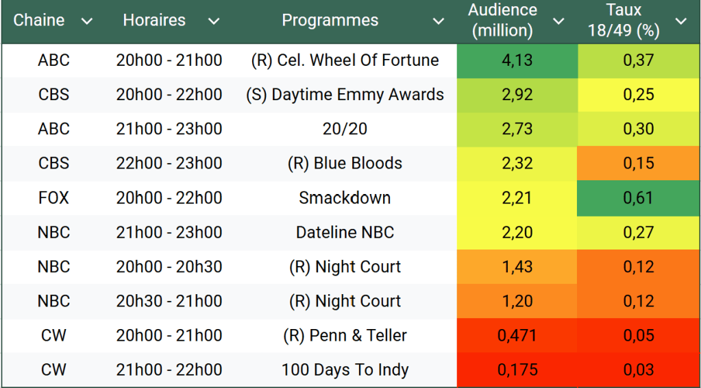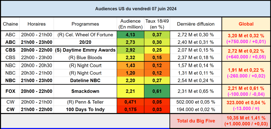 Audiences US du Vendredi 07.06.24 : Excellent score pour la rediffusion de Celebrity Wheel Of Fortune. 20/20 en forme. Daytime Emmy Awards en forte hausse. Thomas Fusil Communiqués Audiences US 12 juin 2024 1 Minute Voici les audiences de la soirée du 7 Juin Les audiences triées (téléspectateurs) Partager : Partager sur X(ouvre dans une nouvelle fenêtre) X Partager sur Facebook(ouvre dans une nouvelle fenêtre) Facebook J’aime chargement… Similaire Publié par Thomas Fusil Voir tous les articles par Thomas Fusil Publié 12 juin 2024