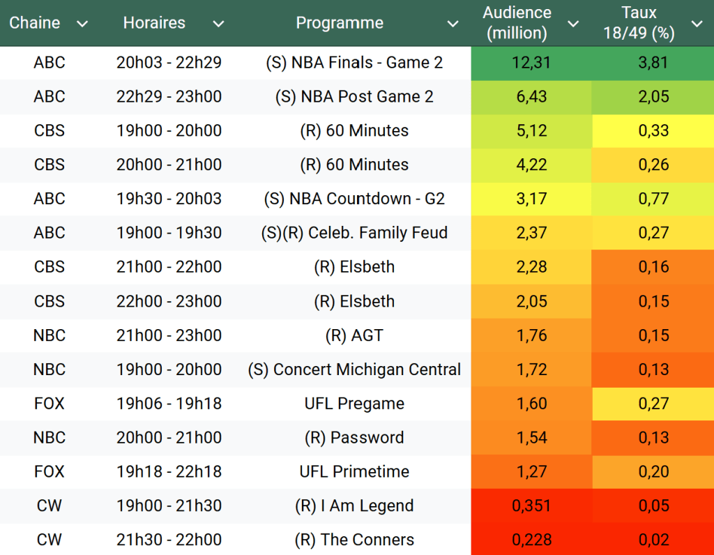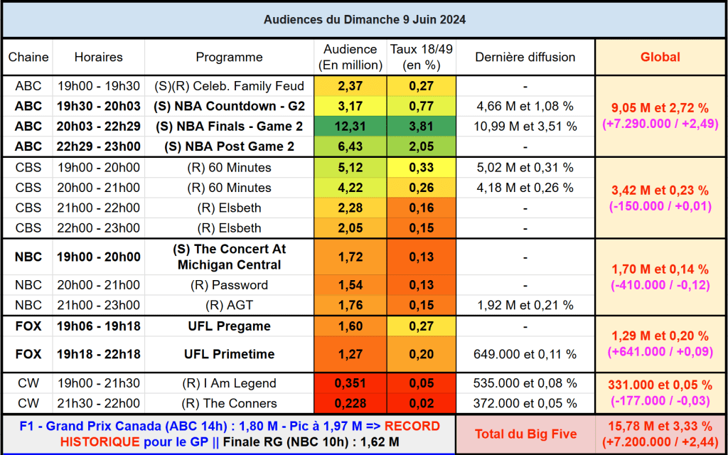 Audiences US du Dimanche 09.06.24 : Record historique pour le Grand Prix du Canada (F1). En prime la NBA est très puissante sur ABC. 60 minutes solide. Thomas Fusil Communiqués Audiences US 13 juin 2024 1 Minute Voici les audiences de la soirée du 9 Juin Audiences triées (téléspectateurs) Partager : Partager sur X(ouvre dans une nouvelle fenêtre) X Partager sur Facebook(ouvre dans une nouvelle fenêtre) Facebook J’aime chargement… Similaire Publié par Thomas Fusil Voir tous les articles par Thomas Fusil Publié 13 juin 2024