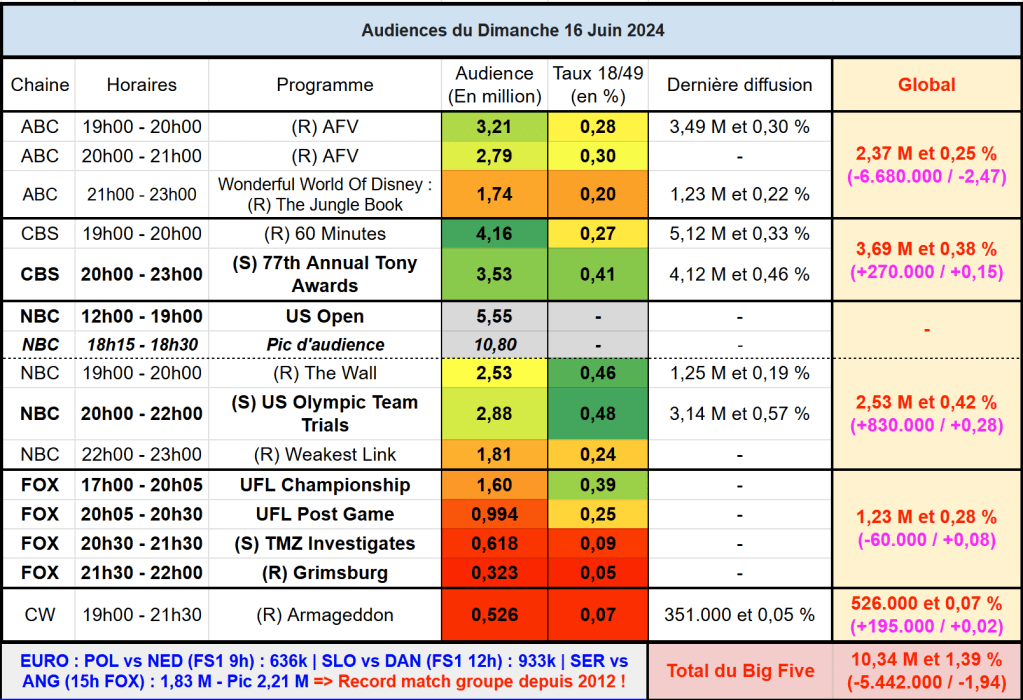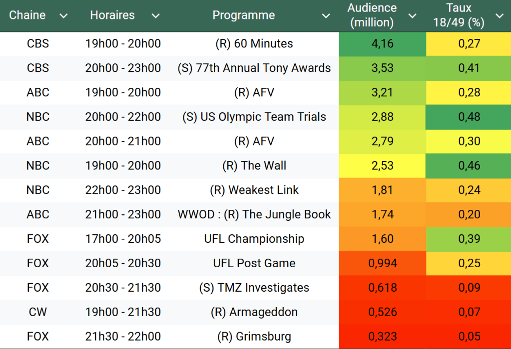 Audiences US du Dimanche 16.06.24 : Les Tony Awards en nette baisse. Les essais olympiques font du bien à NBC. Record pour l’Euro à 15h sur FOX. Thomas Fusil Communiqués Audiences US 19 juin 2024 1 Minute Voici les audiences de la soirée du 16 Juin Audiences triées (téléspectateurs) Partager : Partager sur X(ouvre dans une nouvelle fenêtre) X Partager sur Facebook(ouvre dans une nouvelle fenêtre) Facebook J’aime chargement… Similaire Publié par Thomas Fusil Voir tous les articles par Thomas Fusil Publié 19 juin 2024