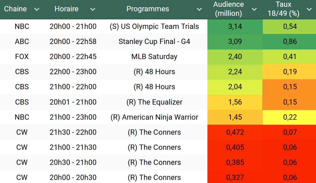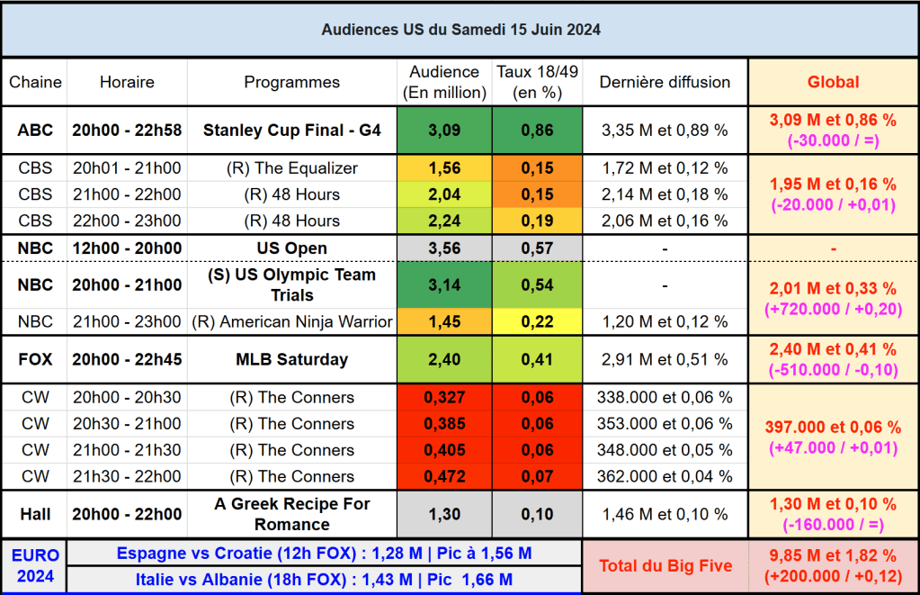 Audiences US du Samedi 15.06.24 : Les essais olympiques dominent sur NBC. La NHL stable. Bon score pour l’Euro sur FOX. Thomas Fusil Communiqués Audiences US 19 juin 2024 1 Minute Voici les audiences de la soirée du 15 Juin Audiences triées (téléspectateurs) Partager : Partager sur X(ouvre dans une nouvelle fenêtre) X Partager sur Facebook(ouvre dans une nouvelle fenêtre) Facebook J’aime chargement… Similaire Publié par Thomas Fusil Voir tous les articles par Thomas Fusil Publié 19 juin 2024