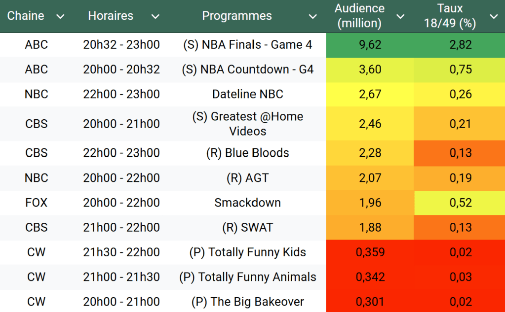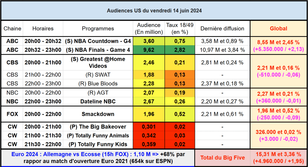 Audiences US du Vendredi 14.06.24 : La NBA passe sous les 10 millions mais reste très large leader. NBC s’en sort bien. Bon démarrage pour l’Euro sur FOX. Thomas Fusil Communiqués Audiences US 19 juin 2024 1 Minute Voici les audiences de la soirée du 14 Juin Audiences triées (téléspectateurs) Partager : Partager sur X(ouvre dans une nouvelle fenêtre) X Partager sur Facebook(ouvre dans une nouvelle fenêtre) Facebook J’aime chargement… Similaire Publié par Thomas Fusil Voir tous les articles par Thomas Fusil Publié 19 juin 2024