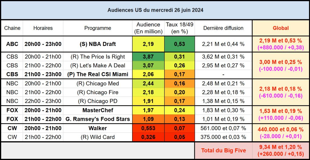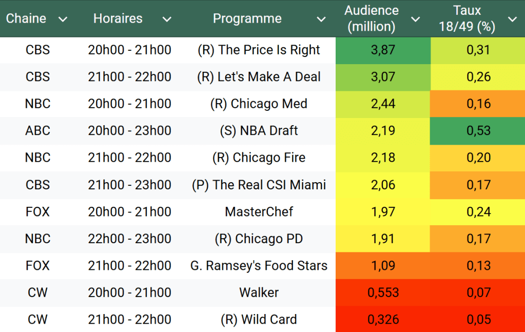 Audiences US du Mercredi 26.06.24 : The Price Is Right leader en hausse sur CBS. NBA Draft stable sur un an. MasterChef progresse. Thomas Fusil Communiqués Audiences US 1 juillet 20241 juillet 2024 1 Minute Voici les audiences de la soirée du 26 Juin Audiences triées (téléspectateurs) Partager : Partager sur X(ouvre dans une nouvelle fenêtre) X Partager sur Facebook(ouvre dans une nouvelle fenêtre) Facebook J’aime chargement… Similaire Publié par Thomas Fusil Voir tous les articles par Thomas Fusil Publié 1 juillet 20241 juillet 2024
