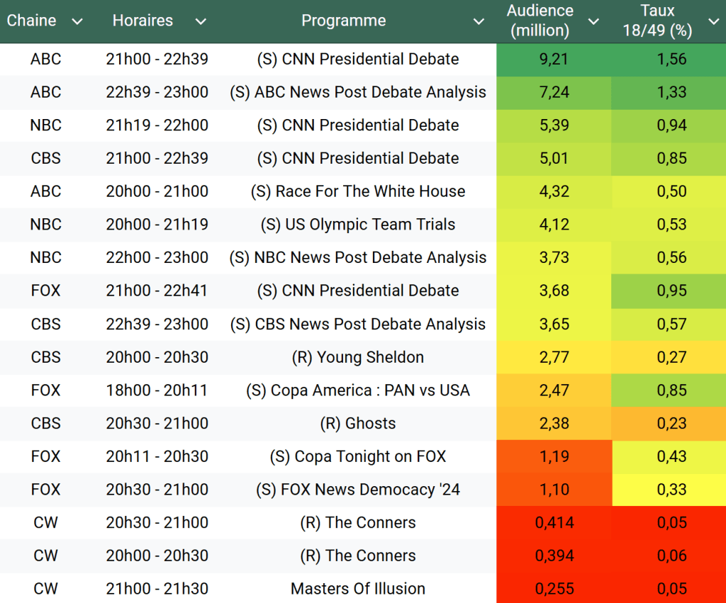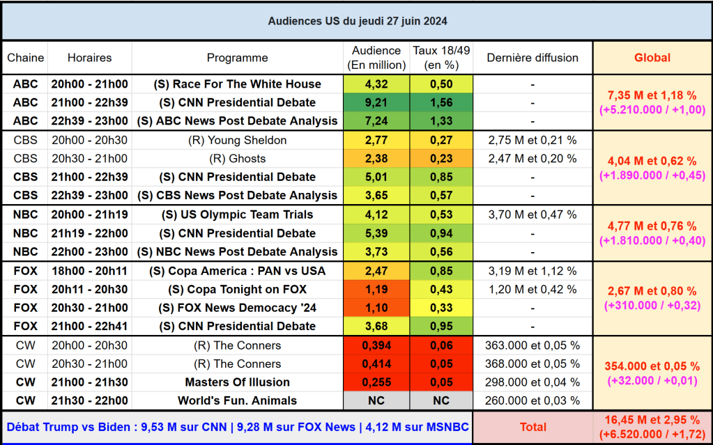 Audiences US du Jeudi 27.06.24 : Carton pour le débat présidentiel sur ABC. NBC, CBS et FOX performent également avec le débat. Le match Copa America des USA en baisse. Thomas Fusil Communiqués Audiences US 2 juillet 2024 1 Minute Voici les audiences de la soirée du 27 Juin Audiences triées (téléspectateurs) Partager : Partager sur X(ouvre dans une nouvelle fenêtre) X Partager sur Facebook(ouvre dans une nouvelle fenêtre) Facebook J’aime chargement… Similaire Publié par Thomas Fusil Voir tous les articles par Thomas Fusil Publié 2 juillet 2024