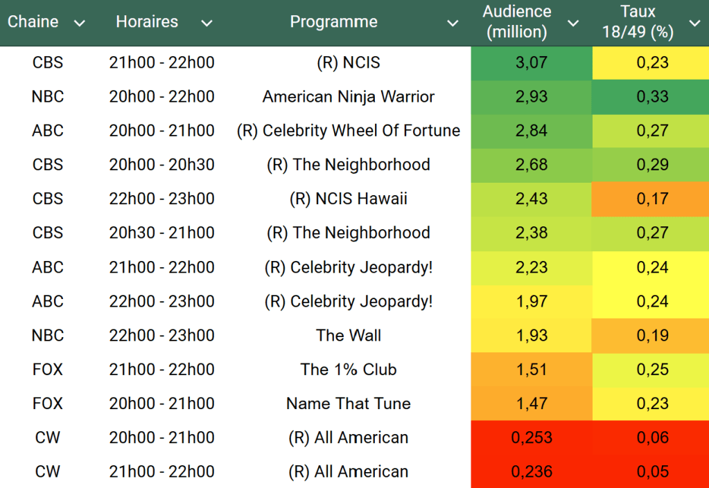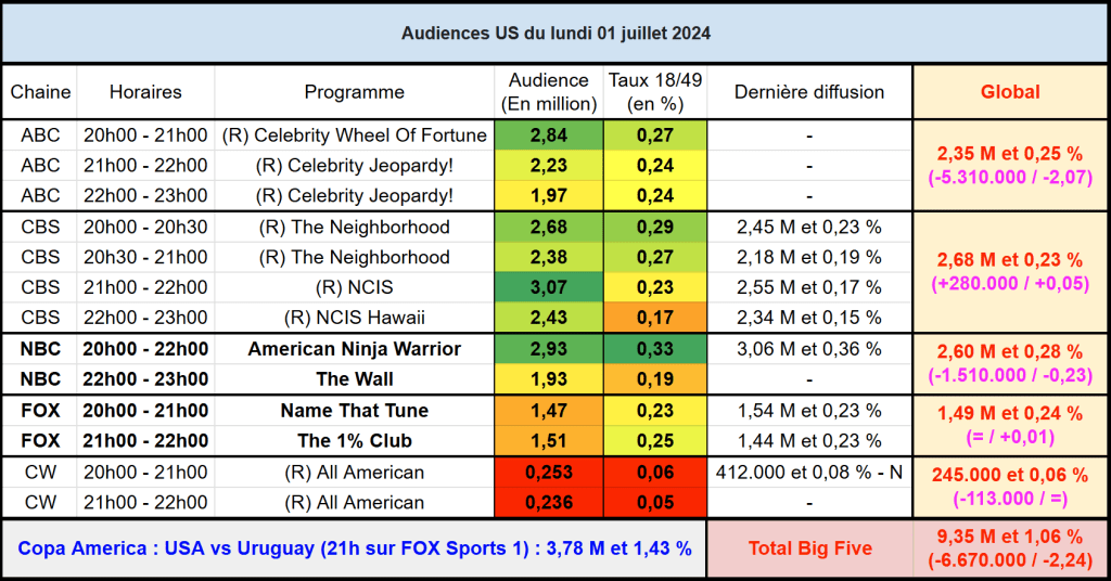 Audiences US du Lundi 01.07.24 : NCIS leader en rediffusion sur CBS. American Ninja Warrior de retour en baisse. FOX stable avec ses jeux. Thomas Fusil Communiqués Audiences US 8 juillet 2024 1 Minute Voici les audiences de la soirée du 1er Juillet Audiences triées (téléspectateurs) Partager : Partager sur X(ouvre dans une nouvelle fenêtre) X Partager sur Facebook(ouvre dans une nouvelle fenêtre) Facebook J’aime chargement… Similaire Publié par Thomas Fusil Voir tous les articles par Thomas Fusil Publié 8 juillet 2024