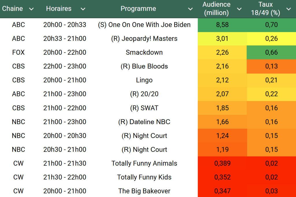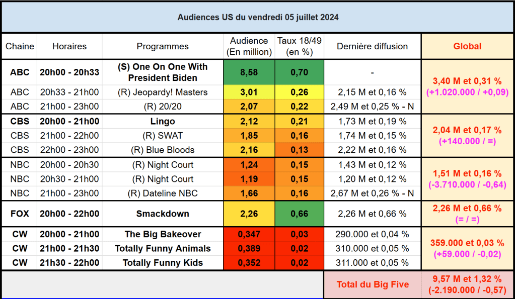 Audiences US du Vendredi 05.07.24 : Gros carton pour l’interview de Joe Biden sur ABC. Lingo remonte. NBC faible ce vendredi. Thomas Fusil Communiqués Audiences US 10 juillet 2024 1 Minute Voici les audiences de la soirée du 5 Juillet Audiences triées (téléspectateurs) Partager : Partager sur X(ouvre dans une nouvelle fenêtre) X Partager sur Facebook(ouvre dans une nouvelle fenêtre) Facebook J’aime chargement… Similaire Publié par Thomas Fusil Voir tous les articles par Thomas Fusil Publié 10 juillet 2024