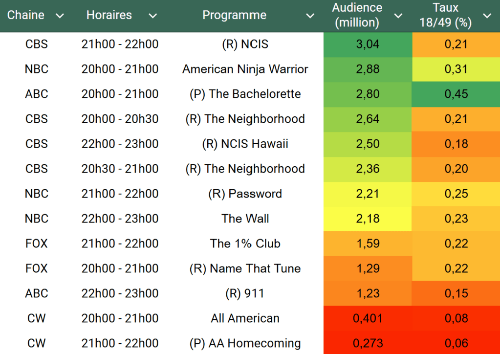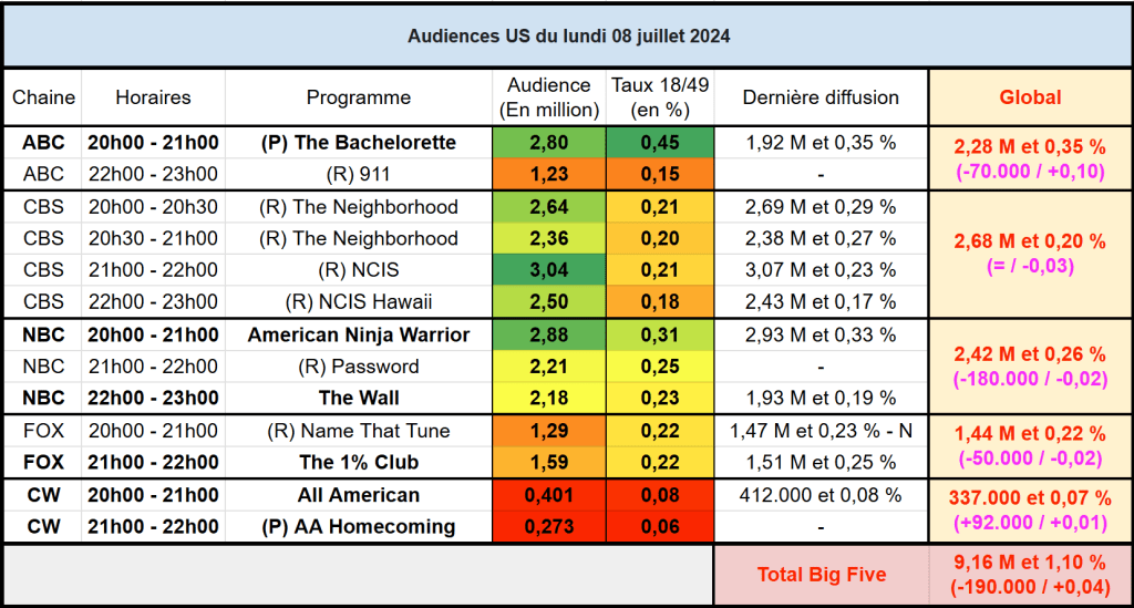 Audiences US du Lundi 08.07.24 : NCIS leader au dessus des 3 millions. The Bachelorette de retour en très forte hausse. Thomas Fusil Communiqués Audiences US 11 juillet 2024 1 Minute Voici les audiences de la soirée du 8 Juillet Audiences triées (téléspectateurs) Partager : Partager sur X(ouvre dans une nouvelle fenêtre) X Partager sur Facebook(ouvre dans une nouvelle fenêtre) Facebook J’aime chargement… Similaire Publié par Thomas Fusil Voir tous les articles par Thomas Fusil Publié 11 juillet 2024