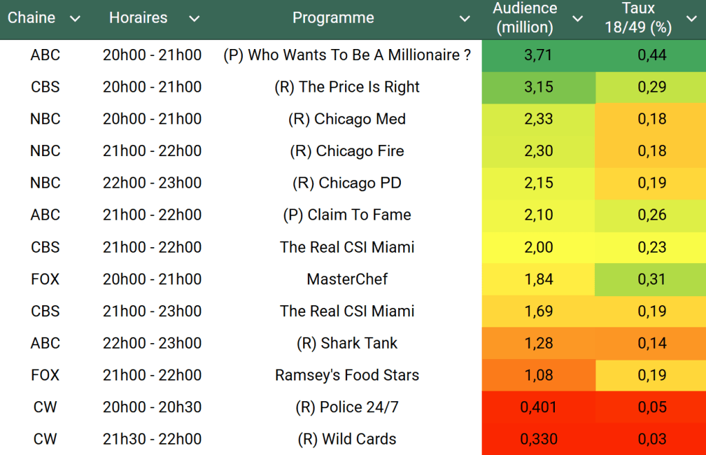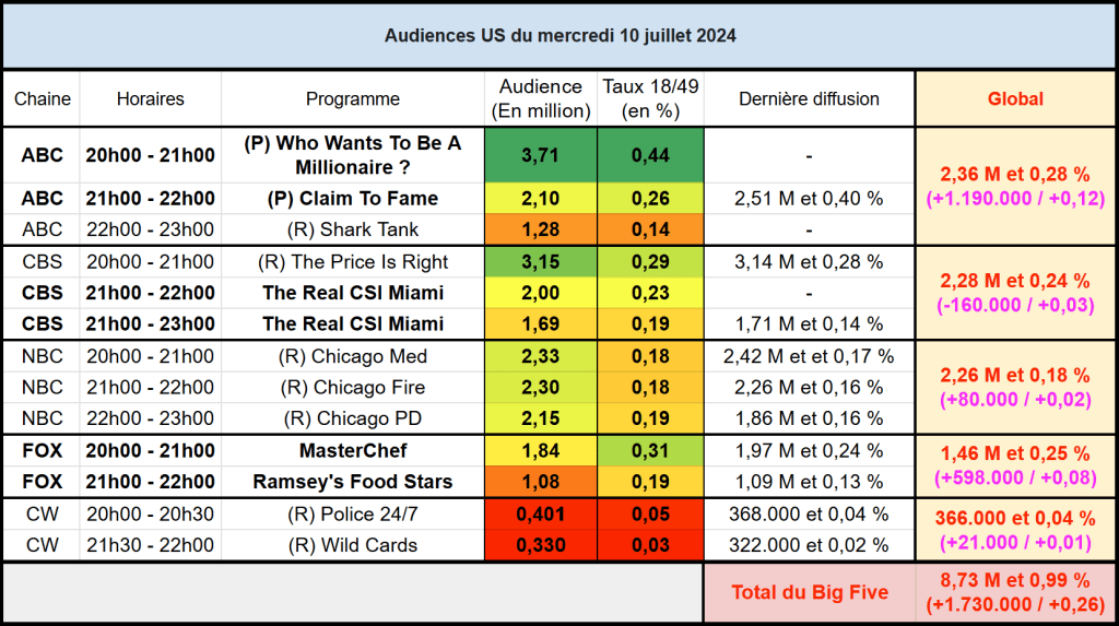 Audiences US du Mercredi 10.07.24 : Retour très solide pour Who Wants To Be A Millionaire, qui se classe leader sur ABC. Claim To Fame en baisse. Thomas Fusil Communiqués Audiences US 12 juillet 2024 1 Minute Voici les audiences de la soirée du 10 Juillet Audiences triées (téléspectateurs) Partager : Partager sur X(ouvre dans une nouvelle fenêtre) X Partager sur Facebook(ouvre dans une nouvelle fenêtre) Facebook J’aime chargement… Similaire Publié par Thomas Fusil Voir tous les articles par Thomas Fusil Publié 12 juillet 2024