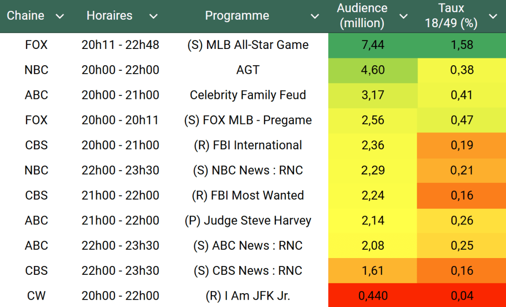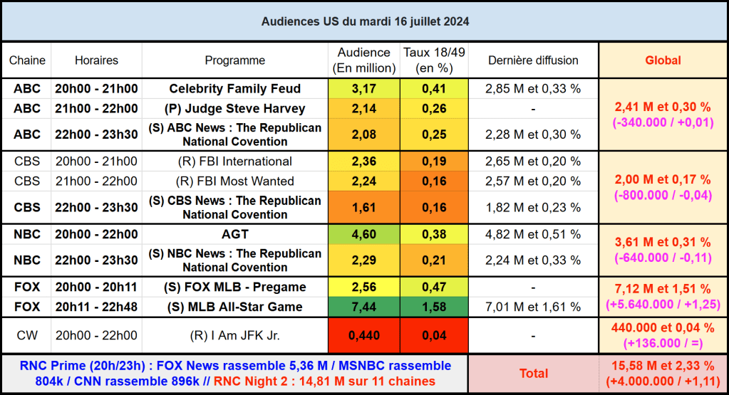 Audiences US du Mardi 16.07.24 : FOX écrase la concurrence avec MLB All Star Game. AGT en baisse. La couverture RNC de NBC passe devant celle de ABC. Thomas Fusil Communiqués Audiences US 22 juillet 2024 1 Minute Voici les audiences de la soirée du 16 Juillet Audiences triées (téléspectateurs) Partager : Partager sur X(ouvre dans une nouvelle fenêtre) X Partager sur Facebook(ouvre dans une nouvelle fenêtre) Facebook J’aime chargement… Similaire Publié par Thomas Fusil Voir tous les articles par Thomas Fusil Publié 22 juillet 2024