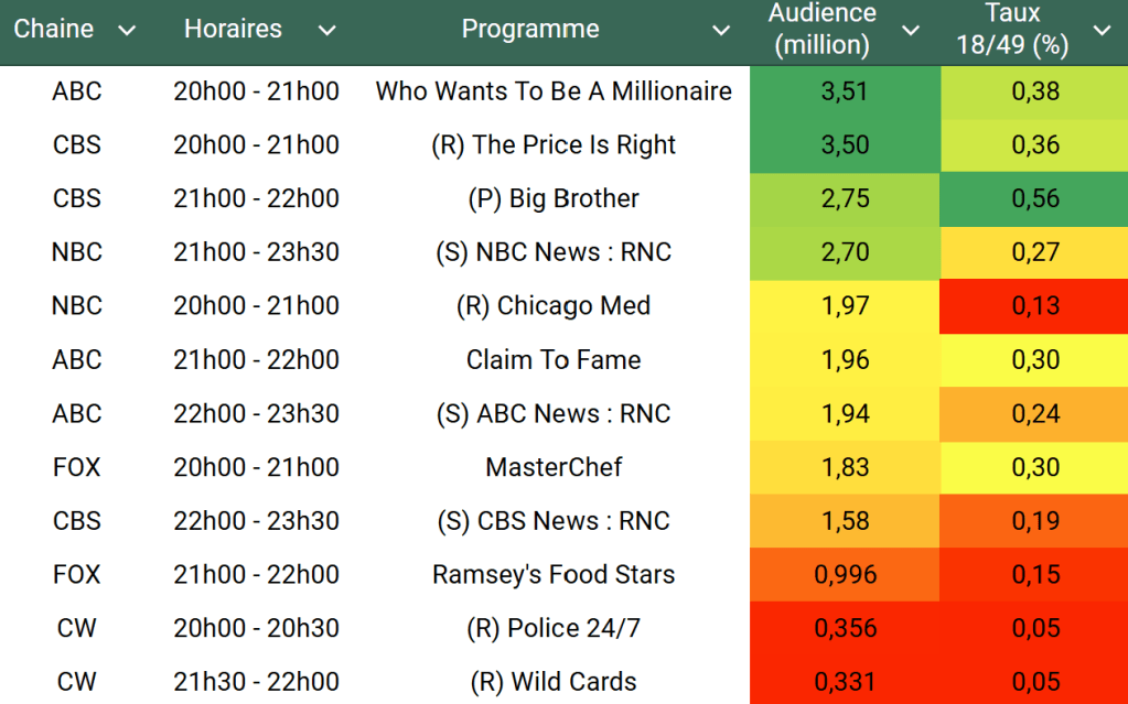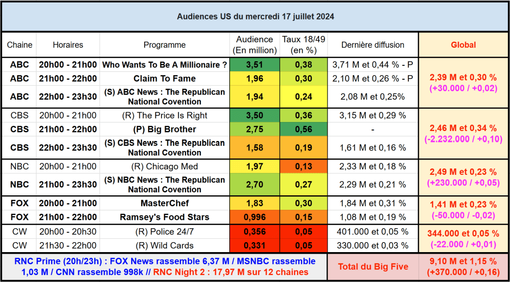 Audiences US du Mercredi 17.07.24 : WWTBAM et The Price Is Right au coude à coude pour le leadership. Big Brother leader cible. La couverture RNC de NBC en forme comparée à ABC et CBS.