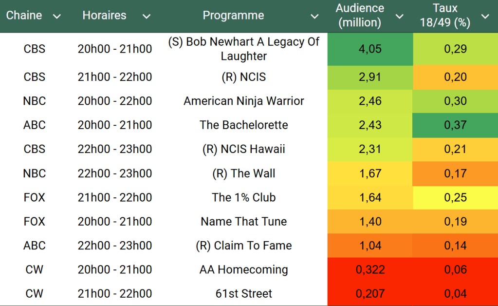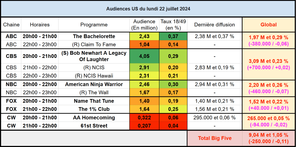 Audiences US du Lundi 22.07.24 : L’hommage à Bob Newhart au top sur CBS. American Ninja Warrior en forte baisse. The Bachelorette leader cible. Thomas Fusil Communiqués Audiences US 28 juillet 2024 1 Minute Voici les audiences de la soirée du 22 Juillet Audiences triées (téléspectateurs) Partager : Partager sur X(ouvre dans une nouvelle fenêtre) X Partager sur Facebook(ouvre dans une nouvelle fenêtre) Facebook J’aime chargement… Similaire Publié par Thomas Fusil Voir tous les articles par Thomas Fusil Publié 28 juillet 2024