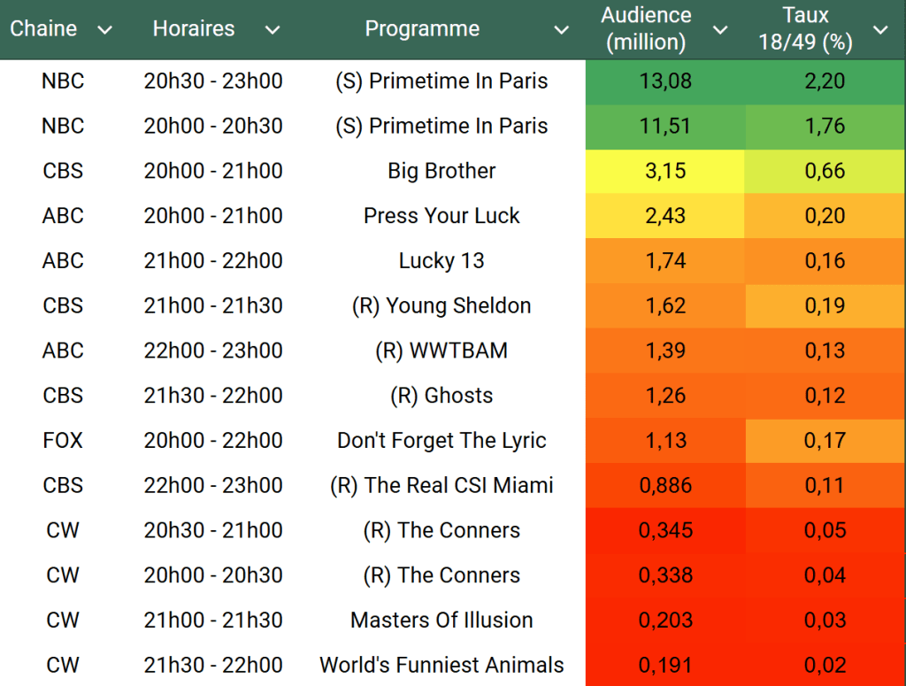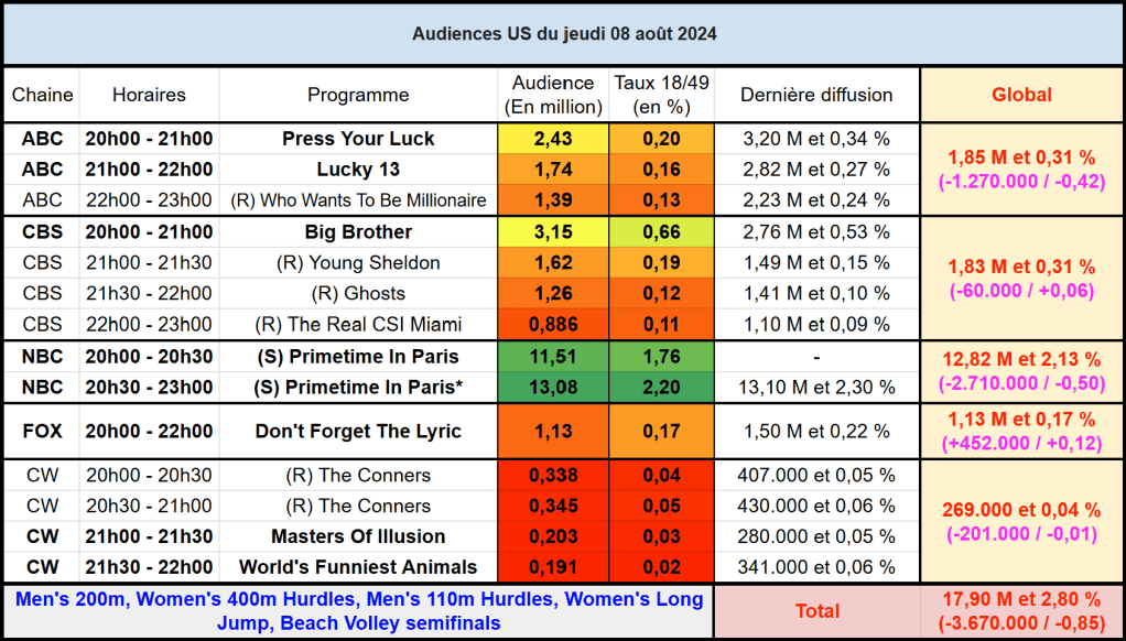 Audiences US du Jeudi 08.08.24 : Près de 13 millions de téléspectateurs pour les médailles en athlétisme sur NBC. Big Brother au plus haut. Lucky 13 s’effondre. Thomas Fusil Communiqués Audiences US 11 août 2024 1 Minute Voici les audiences de la soirée du 8 Aout Audiences triées (téléspectateurs) Partager : Partager sur X(ouvre dans une nouvelle fenêtre) X Partager sur Facebook(ouvre dans une nouvelle fenêtre) Facebook J’aime chargement… Similaire Publié par Thomas Fusil Voir tous les articles par Thomas Fusil Publié 11 août 2024