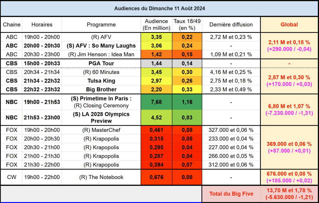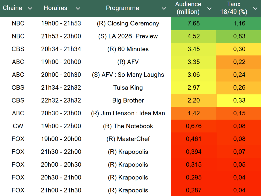 Audiences US du Dimanche 11.08.24 : NBC termine sa période olympique en tête. 60 Minutes et Big Brother en baisse. CW, en forme, est une nouvelle fois devant FOX. Thomas Fusil Communiqués Audiences US 15 août 2024 1 Minute Voici les audiences de la soirée du 11 Aout Audiences triées (téléspectateurs) Partager : Partager sur X(ouvre dans une nouvelle fenêtre) X Partager sur Facebook(ouvre dans une nouvelle fenêtre) Facebook J’aime chargement… Similaire Publié par Thomas Fusil Voir tous les articles par Thomas Fusil Publié 15 août 2024