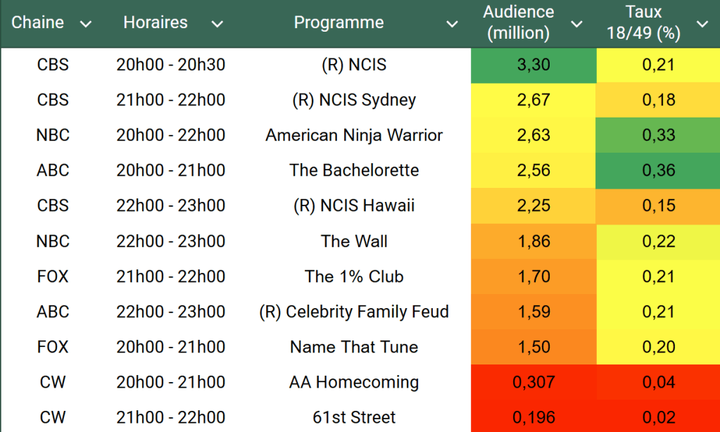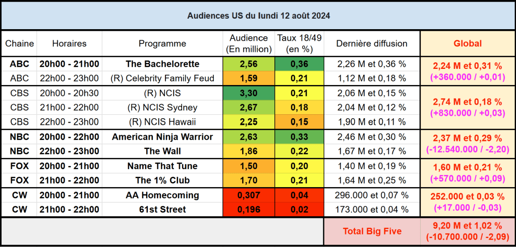 Audiences US du Lundi 12.08.24 : CBS leader avec sa franchise NCIS. The Bachelorette et FOX remontent. Ninja Warrior revient en hausse. Thomas Fusil Communiqués Audiences US 16 août 202416 août 2024 1 Minute Voici les audiences de la soirée du 12 Aout Audiences triées (téléspectateurs) Partager : Partager sur X(ouvre dans une nouvelle fenêtre) X Partager sur Facebook(ouvre dans une nouvelle fenêtre) Facebook J’aime chargement… Similaire Publié par Thomas Fusil Voir tous les articles par Thomas Fusil Publié 16 août 202416 août 2024