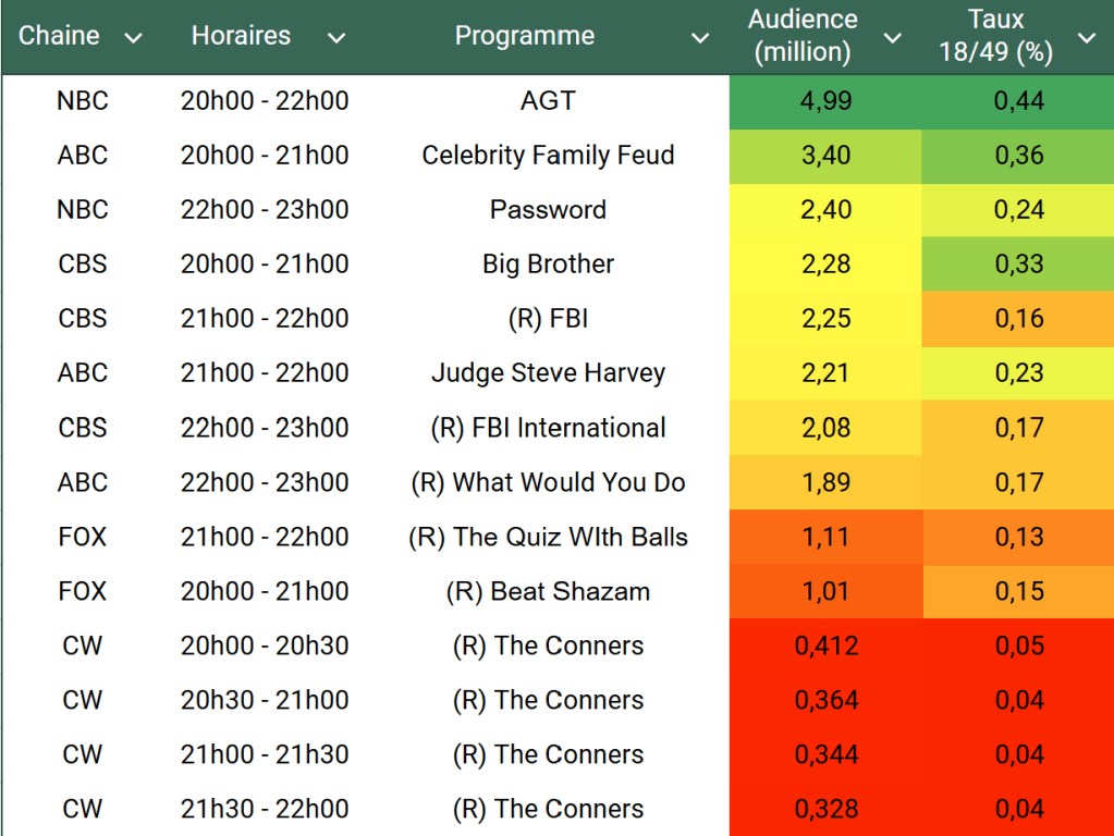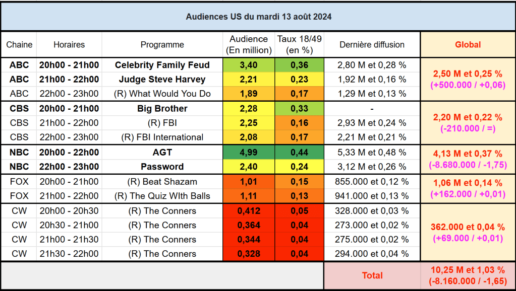 Audiences US du Mardi 13.08.24 : AGT leader en baisse. Celebrity Family Feud en forte hausse contrairement à Password. Petit score pour Big Brother. Thomas Fusil Communiqués Audiences US 16 août 2024 1 Minute Voici les audiences de la soirée du 13 Aout Audiences triées (téléspectateurs) Partager : Partager sur X(ouvre dans une nouvelle fenêtre) X Partager sur Facebook(ouvre dans une nouvelle fenêtre) Facebook J’aime chargement… Similaire Publié par Thomas Fusil Voir tous les articles par Thomas Fusil Publié 16 août 2024