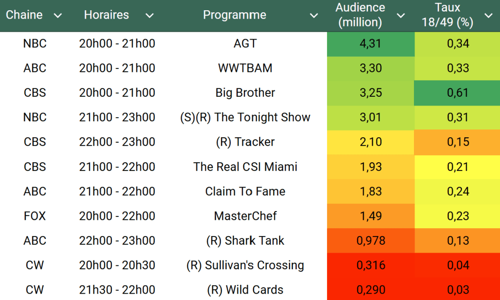 Audiences US du Mercredi 14.08.24 : NBC leader avec AGT. Joli score pour la rediff de The Tonight Show. Big Brother au plus haut. Thomas Fusil Communiqués Audiences US 16 août 2024 1 Minute Voici les audiences de la soirée 14 Aout Audiences triées (téléspectateurs) Partager : Partager sur X(ouvre dans une nouvelle fenêtre) X Partager sur Facebook(ouvre dans une nouvelle fenêtre) Facebook J’aime chargement… Similaire Publié par Thomas Fusil Voir tous les articles par Thomas Fusil Publié 16 août 2024