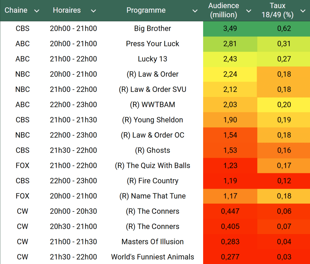 Audiences US du Jeudi 15.08.24 : Big Brother leader au plus haut sur CBS. Press Your Luck et Lucky13 remontent. NBC sous les 2 millions. Thomas Fusil Communiqués Audiences US 17 août 2024 1 Minute Voici les audiences de la soirée du 15 Aout Audiences triées (téléspectateurs) Partager : Partager sur X(ouvre dans une nouvelle fenêtre) X Partager sur Facebook(ouvre dans une nouvelle fenêtre) Facebook J’aime chargement… Similaire Publié par Thomas Fusil Voir tous les articles par Thomas Fusil Publié 17 août 2024