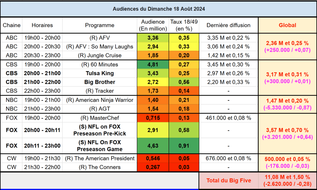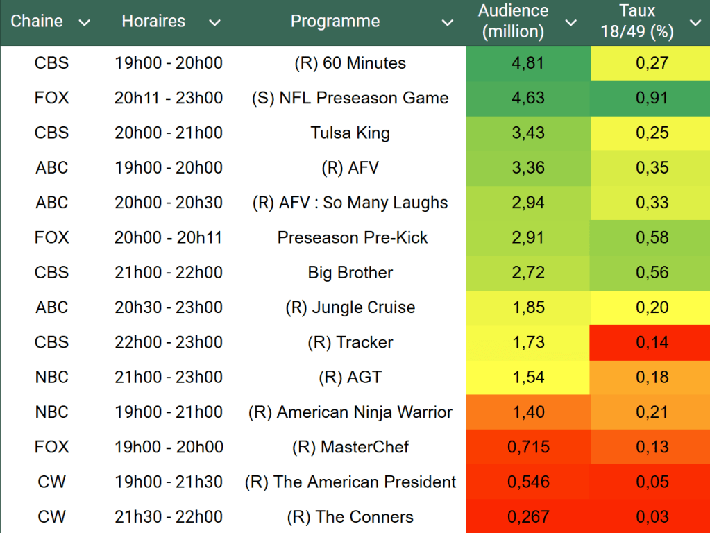 Audiences US du Dimanche 18.08.24 : 60 Minutes leader en forte hausse. FOX domine sur l’ensemble de la soirée avec la NFL. NBC sous les 1,5 millions. Thomas Fusil Communiqués Audiences US 21 août 2024 1 Minute Voici les audiences de la soirée du 18 Aout Audiences triées (téléspectateurs) Partager : Partager sur X(ouvre dans une nouvelle fenêtre) X Partager sur Facebook(ouvre dans une nouvelle fenêtre) Facebook J’aime chargement… Similaire Publié par Thomas Fusil Voir tous les articles par Thomas Fusil Publié 21 août 2024