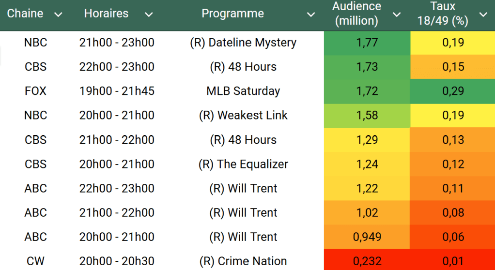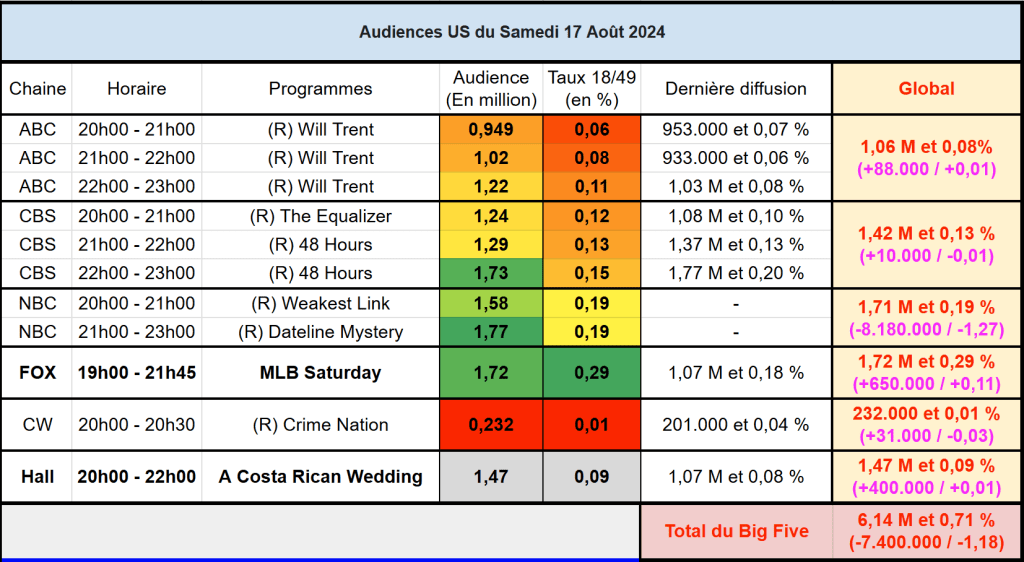 Audiences US du Samedi 17.08.24 : Aucune chaine ne dépasse les 1,8 millions samedi soir. FOX leader sur la soirée avec le baseball. Hallmark devant CBS et ABC. Thomas Fusil Communiqués Audiences US 21 août 2024 1 Minute Voici les audiences de la soirée du 17 Aout Audiences triées (téléspectateurs) Partager : Partager sur X(ouvre dans une nouvelle fenêtre) X Partager sur Facebook(ouvre dans une nouvelle fenêtre) Facebook J’aime chargement… Similaire Publié par Thomas Fusil Voir tous les articles par Thomas Fusil Publié 21 août 2024