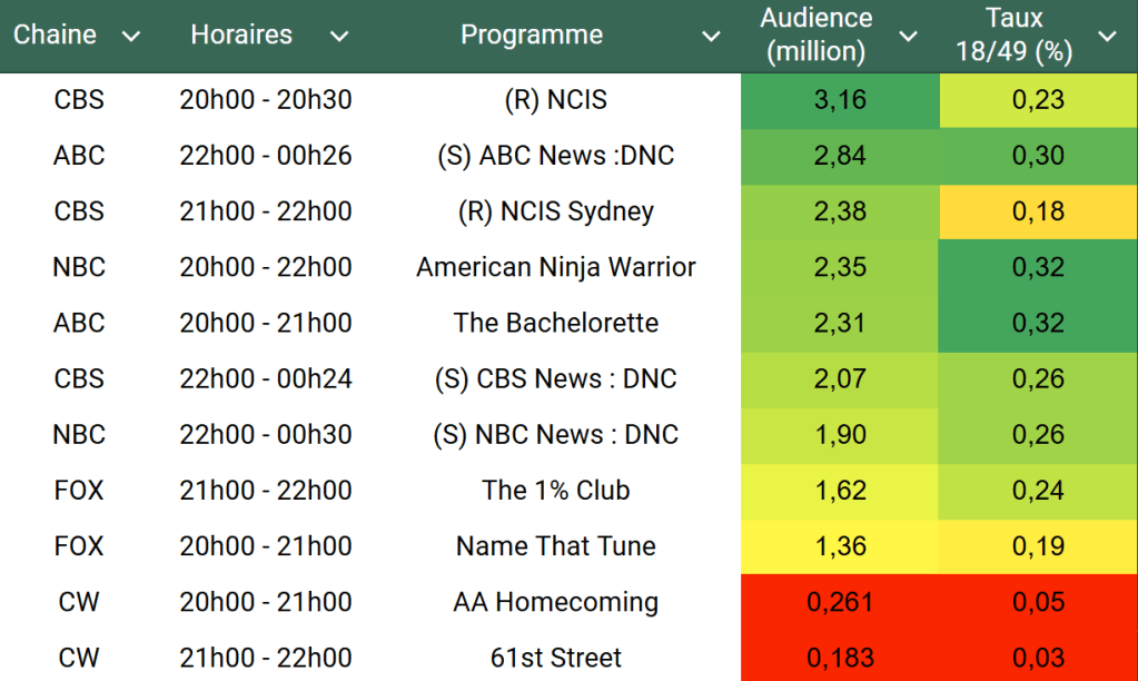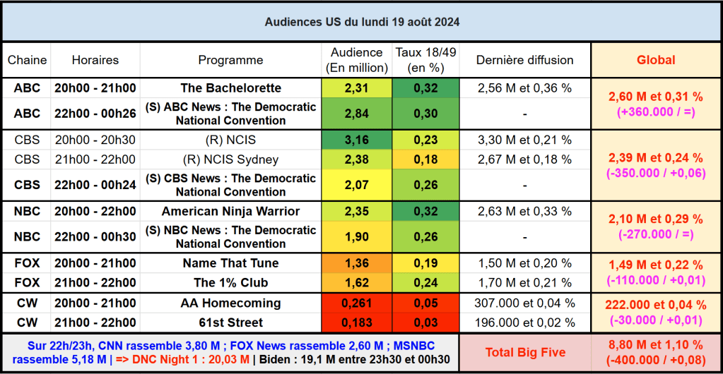 Audiences US du Lundi 19.08.24 : La rediffusion de NCIS en tête. La couverture de ABC pour la convention démocrate et le discours de Joe Biden devant celles de CBS et NBC.
