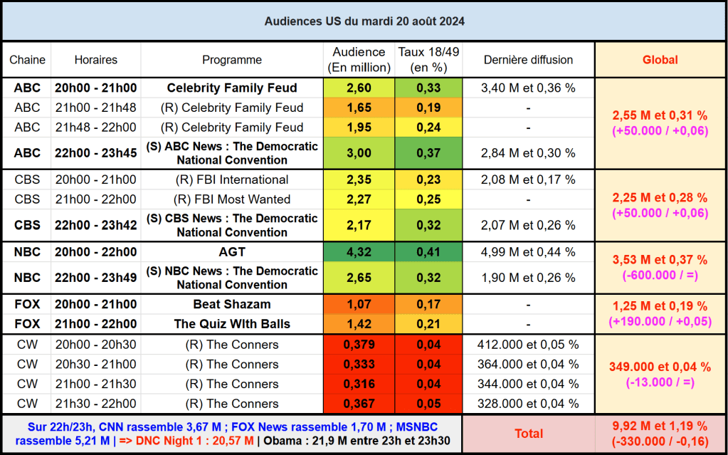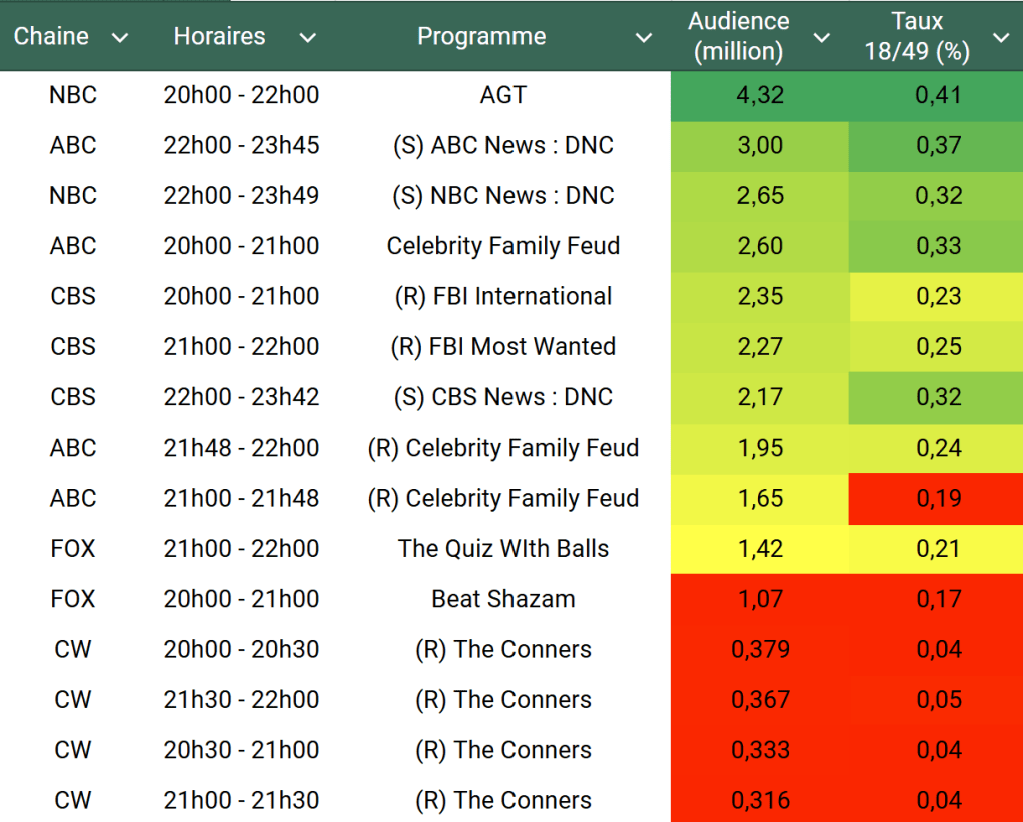 Audiences US du Mardi 20.08.24 : AGT leader en nette baisse. La couverture de la convention démocrate et du discours de Barack Obama en hausse sur ABC, CBS et NBC. Thomas Fusil Communiqués Audiences US 22 août 2024 1 Minute Voici les audiences de la soirée du 20 Aout Audiences triées (téléspectateurs) Partager : Partager sur X(ouvre dans une nouvelle fenêtre) X Partager sur Facebook(ouvre dans une nouvelle fenêtre) Facebook J’aime chargement… Similaire Publié par Thomas Fusil Voir tous les articles par Thomas Fusil Publié 22 août 2024